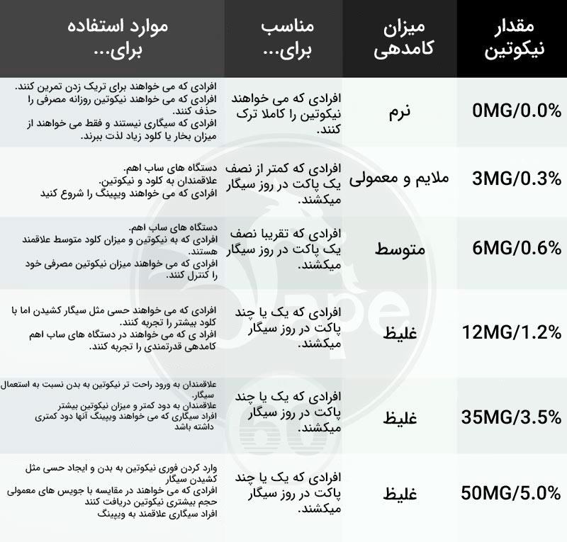 این بخش بسیار مهم است به خصوص برای افرادی که میخواهند سیگار را با استفاده از دستگاههای ویپینگ ترک کنند. اگر مقدار نیکوتین به اشتباه کمتر از نیاز انتخاب شود ممکن است نتوانند فرد ویپر را راضی کند و آن را دوباره به سمت سیگار ببرد! در تصویر زیر می توانید میزان نیکوتین مناسب هر گروه از ویپرها را مشاهده کنید.